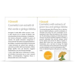 Minipliant informativ cu prezentarea produselor cosmetice pentru hotel din gama Girasoli – imbogatite cu ceai verde si ginkgo biloba, cu proprietati hranitoare, emoliente si antioxidante.