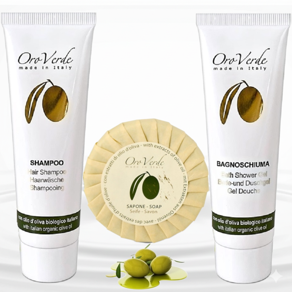 Set Cosmetice Hotel OROVERDE 5 – imbogatite cu unul dintre cele mai nobile si importante ingrediente active prezente in natura: Uleiul de Masline Organic