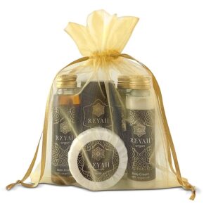 Kit-ul Reyah include produse cosmetice de inalta clasa, ambalate in flacoane elegante si rafinate, cu detalii maro inchis si aurii cu capac auriu din aluminiu. Capacul are sigiliu, pentru a garanta produse sigure si inviolabile pentru a indeplini cerintele de garantie si siguranta.