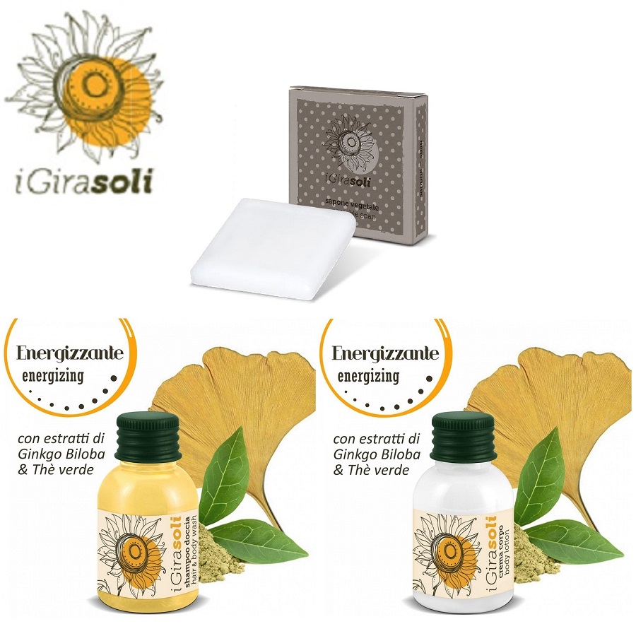 Pachet Cosmetice Hotel Girasoli, pe baza de Extracte energizante de Ginkgo Biloba si Ceai Verde, fara parabeni, ofera o placuta senzatie de energie, prospetime, relaxare si confort
