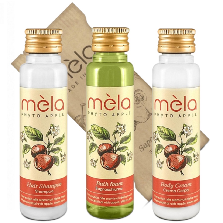 - Cosmeticele hoteliere Mela se bazeaza pe utilizarea moleculelor de origine vegetala – celulele stem ale marului – definite și izolate chimic. Concret, acestea sunt formulari cosmetice capabile sa obțina rezultate care altfel ar fi greu de obținut cu extractele vegetale clasice. Acest set de cosmetice este dedicat pretioaselor proprietati ale celulelor stem de mar, un fruct natural bogat in fitonutrienti.