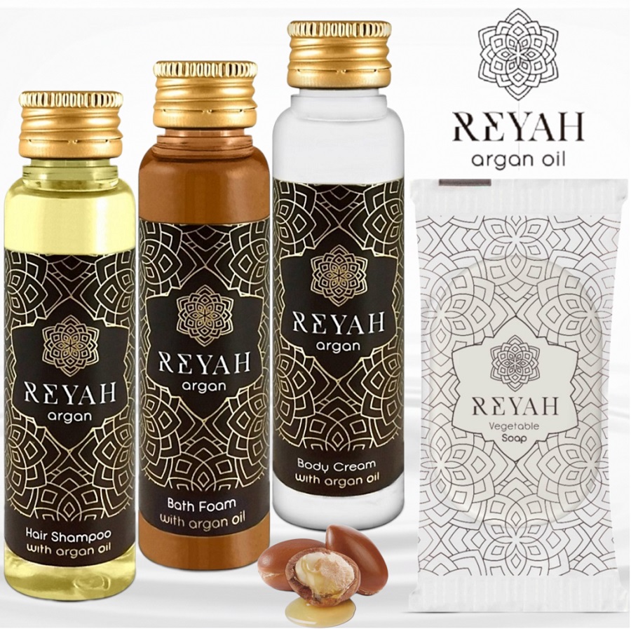 Pachet Cosmetice Hotel – Reyah 1, contine produse imbogatite cu unul din cele mai pretioase uleiuri din lume, extras din nucile arborelui de argan, care creste exclusiv în Maroc – Uleiul de Argan